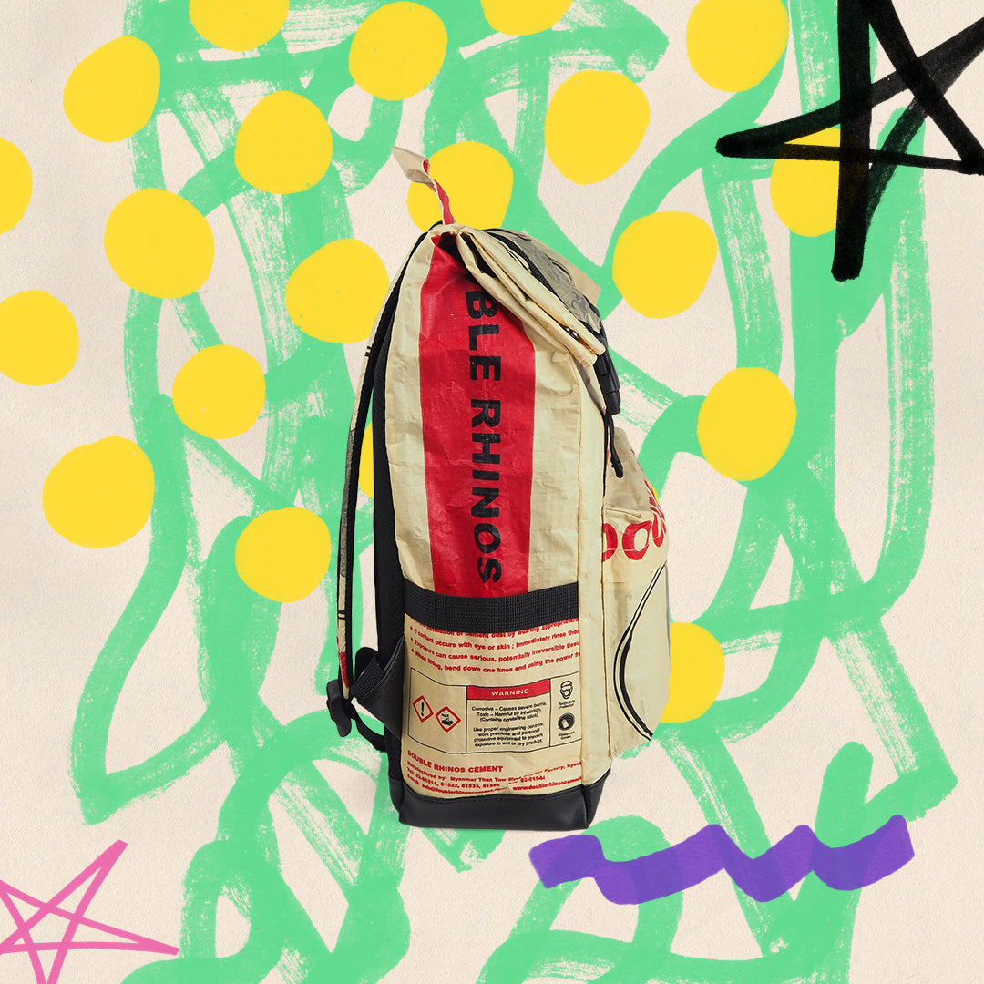 Die Zementsäcke aus denen wir die Rucksäcke upcylen bestehen aus PP-Gewebesäcken, die in Südostasien für Zementsäcke genutzt werden. Die Säcke sind leicht, strapazierfähig, feuchtigkeitsresistent und sehr robust, was sie ideal für das Verpacken von schwerem Zement macht. Die gewebte Struktur verleiht zusätzliche Festigkeit, so dass die Zementsäcke problemlos für bis zu 50KG genutzt werden. Perfekt also für einen Rucksack!