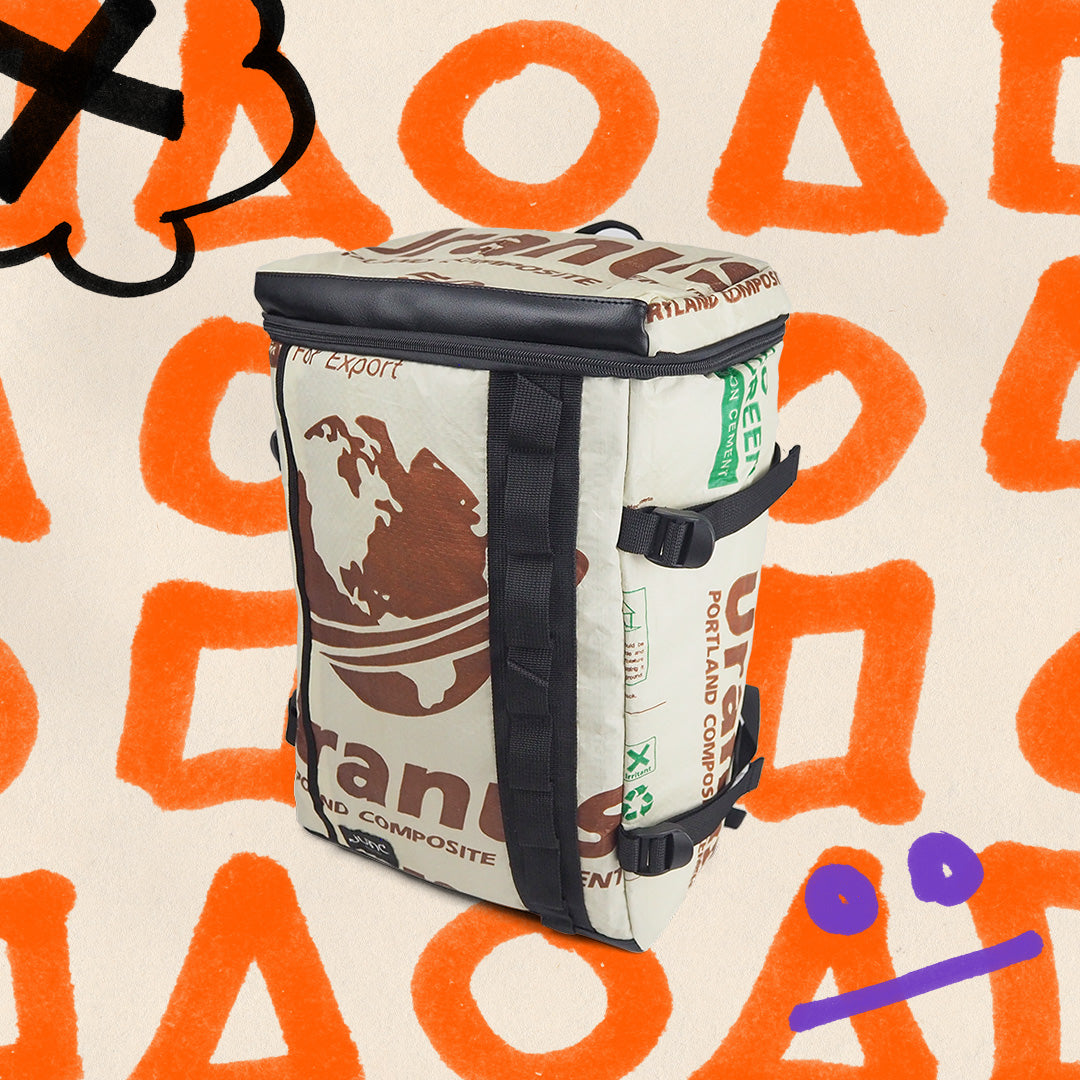 Die Zementsäcke, aus denen wir die Rucksäcke upcyclen, bestehen aus PP-Gewebesäcken, die in Südostasien für Zementsäcke genutzt werden. Die Säcke sind leicht, strapazierfähig, feuchtigkeitsresistent und sehr robust, was sie ideal für das Verpacken von schwerem Zement macht. Die gewebte Struktur verleiht zusätzliche Festigkeit, sodass die Zementsäcke problemlos für bis zu 50KG genutzt werden. Perfekt also für einen Rucksack!
